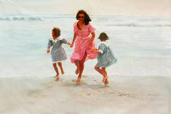 In “Seaside Vacation,” Igor Galan invites us into a cherished memory of familial joy and seaside serenity through his remarkable mastery of realism. The painting captures a mother and her daughters as they share a carefree moment on the beach, running hand-in-hand against the backdrop of softly rolling waves. Galan’s skillful attention to detail creates an almost photorealistic effect, with every shadow, highlight, and texture meticulously rendered. From the vibrant motion of flowing dresses to the serene glow of sunlight on their skin, the scene is brought to life with astonishing clarity. A timeless celebration of family, nature, and connection, this large-scale masterpiece demonstrates Galan’s ability to translate intimate memories into monumental works. While this piece has been sold, the artist is open to creating personal, emotive commissions for collectors.