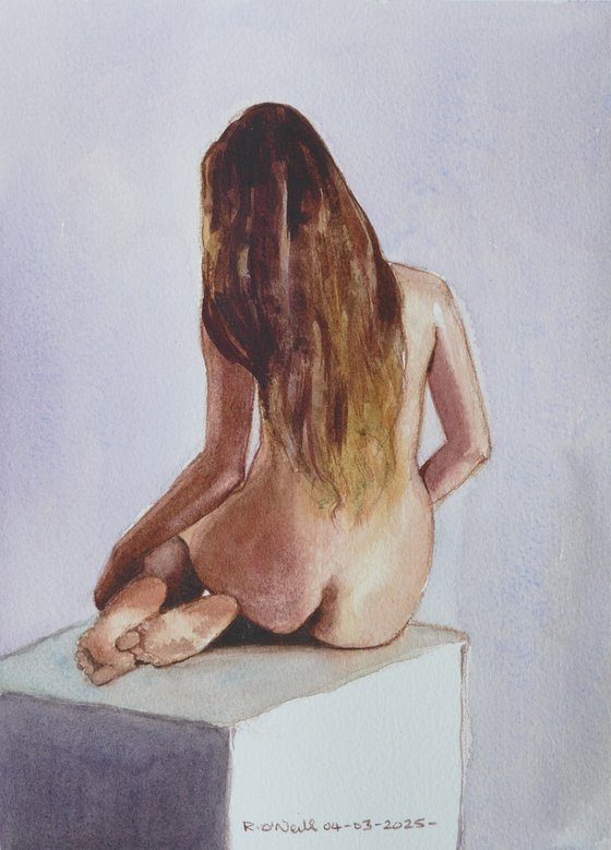 A study of a seated female nude, painted in watercolour and derwent inktense coloured pencil on 300gsm Canson Aquarelle watercolour paper. It will be packed between layers of cardboard (see me at work pic) This painting is sold unframed.