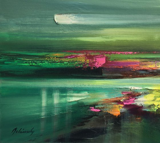 Beata Belanszky - Demko, together with God, is a co-creator of the world, a Concreatrix. She creates and destroys multiple worlds daily. Solar flares, sea floods, and iceberg convulsions line up, and Beáta, like a Herculean Amazon, comprehends these world-formulas. Each piece of hers is imbued with a hyper-realistic authenticity. Honestly, year after year, I follow Beáta’s creative furor with hidden concern. How long can this nerve, bone, and marrow-consuming creation be sustained? Somehow, she models creation from nothingness. And although we know she brings forth pure imaginary landscapes, we do not feel even a hint of falseness. In an intensely magical compression, the blue is real water, the above is sky, the raging sun is the light burst, and the piled-up earth layers are the blacks. In the center of the picture, the starting point opens up, like a firing pin. Beáta’s landscapes enrich the world’s geography. In a certain sense, this creation structure embodies par excellence the painterliness. Ex nihilo nihil fit. Instead: ex nihilo pantos fit. Beáta derives everything from nothingness.“ - Kamil Turai - art philosopher - Hungary, 2024