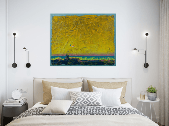 The painting style is rather pasty. Gallery stretched canvas with painted edges so it can be exhibited unframed. On the back of the work there is the author's technical description, a signature with a seal and tools for mounting on the wall.