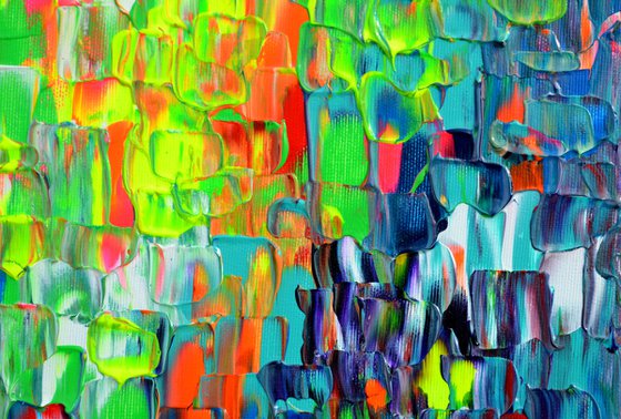 The technique I used is: palette knife, professional varnished acrylic pigments, neon acrylics on stretched 3D canvas. At the end I covered with a glossy coat of varnish, to protect it against UV and dust.