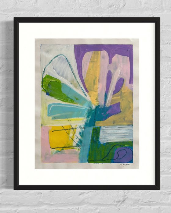 "Soft Currents" (Set of 4) is a series of four mixed media works on canvas sheet created using acrylic paint, oil pastel and spray paint. The paintings are flowing, abstract works built around soft yellows, purples and touches of green. Painted instinctively, each piece captures a gentle and joyful energy.