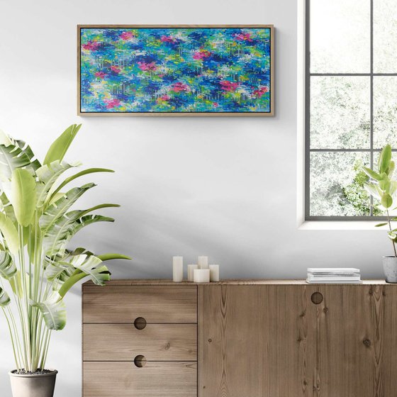 This abstract oil painting evokes the essence of a dreamlike water garden, reminiscent of Monet’s reflections, yet infused with my distinct vibrant energy. Bursts of pink, yellow, and orange float on layers of luminous blues and greens, suggesting blooming life amidst fluid serenity. The vertical streaks of white and blue may symbolize rainfall or reflections, hinting at memory and transience. Altogether, the piece speaks to a place of emotional stillness and wonder—perhaps a symbolic "somewhere in Normandy" where peace and color coexist.