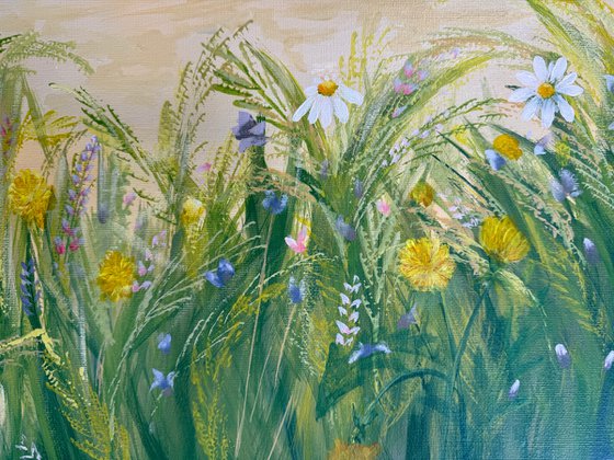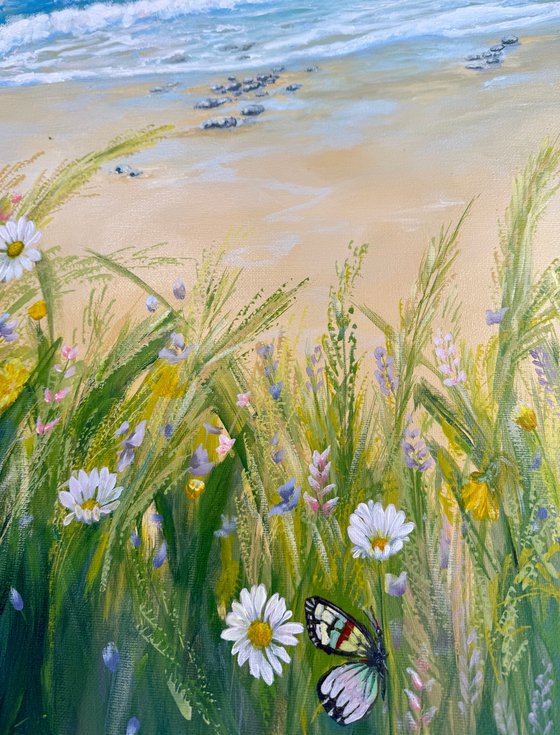 The foreground is full of gentle life: daisies, seashore grass, little flecks of wildflowers and a single butterfly-a secret companion your stolen moment of solitude. Light plays across the sky and sea in soft gradients, making this a piece that calms and soothes.