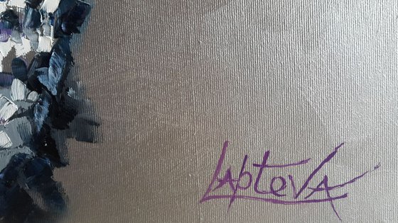 The painting was created on a silver background with oil paints. The edges of the painting are painted