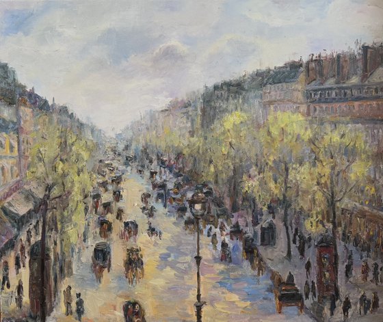 This artwork vividly captures a bustling city scene, showcasing a street teeming with activity. The perspective draws the viewer into the avenue, lined with elegant buildings and delicately painted trees. The palette is vibrant yet soft, dominated by hues of yellow and blue, infusing the scene with a lively yet serene ambiance. Horse-drawn carriages and pedestrians fill the street, illustrating a moment frozen in time that reflects the energy of urban life. The use of light is masterful, with reflections glistening on the wet pavement, suggesting a recent rain. The composition is balanced, with an inviting clarity that guides the eye through the lively thoroughfare. Notably, the Impressionistic style is evident in the loose brushstrokes, creating a dreamlike quality that elevates the everyday scene into a timeless spectacle, making it a quintessential example of the genre’s ability to capture the essence of modernity. This work was inspired by a visit to Paris and the Musée Dorsay, which houses works by the impressionist Pissarro and many other French artists.