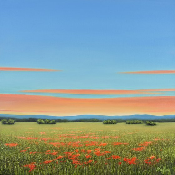 Spring Poppies is an original oil painting by Suzanne Vaughan from the Blue Sky Series. A modern minimal landscape with a fresh atmospheric feel and contemporary color palette featuring a vibrantly colored sky above distant hills and a lush green field of orange poppies.