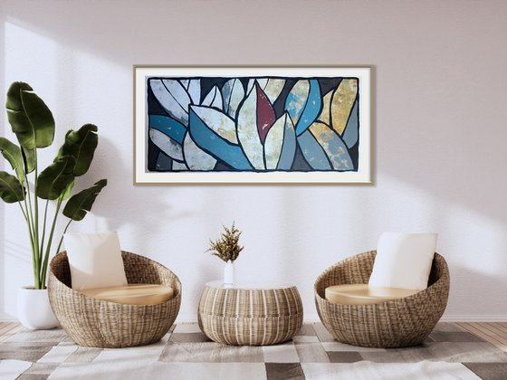 Painted on high quality canvas using acrylic paint. Painting can be either stretched on wooden bars (with plenty of spare canvas to go around the sides - overall canvas size is 160cm x 80cm to be stretched on 150cm x 70cm bars) or mounted in a frame. The painting will be rolled up and safely packaged for postage.