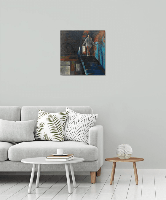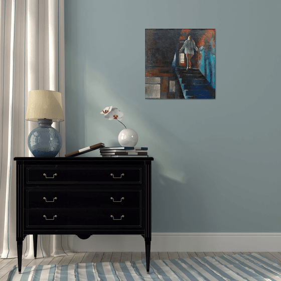 Executed with layered brushwork and a strong play of contrast, this piece speaks to the quiet drama of personal journeys and the beauty of solitary moments. It invites the viewer to step inside, to climb those same unseen stairs toward light, hope, or perhaps discovery.