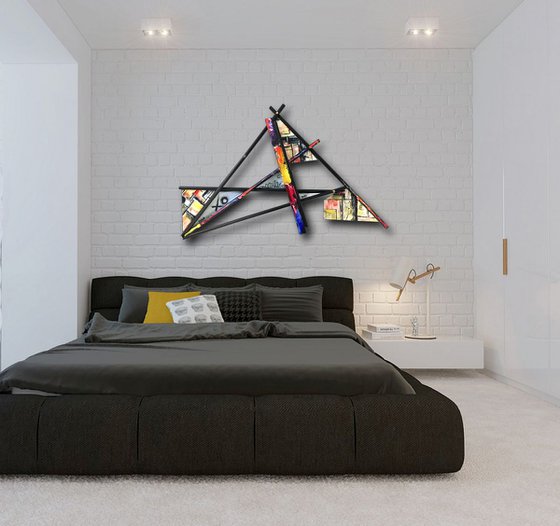 It is beautiful and rugged and fun to look at from multiple angles and I have constructed this frame myself out of an old display easel, sawed up older painting, and an old work shirt from my restaurant years, when I struggled to pay the bills and stay afloat as an artist. Using these personal objects as well as the symbols that pop up in the work is not by accident. It is a recognition of a darker period in my art career when all seemed hopeless. This painting is both a recognition of this period and is also meant to represent a triumph of spirit; shouting that I made it through and am still here creating my art. It is a highly geometrical, personal, colorful and textured piece and is truly an original artwork like no other.