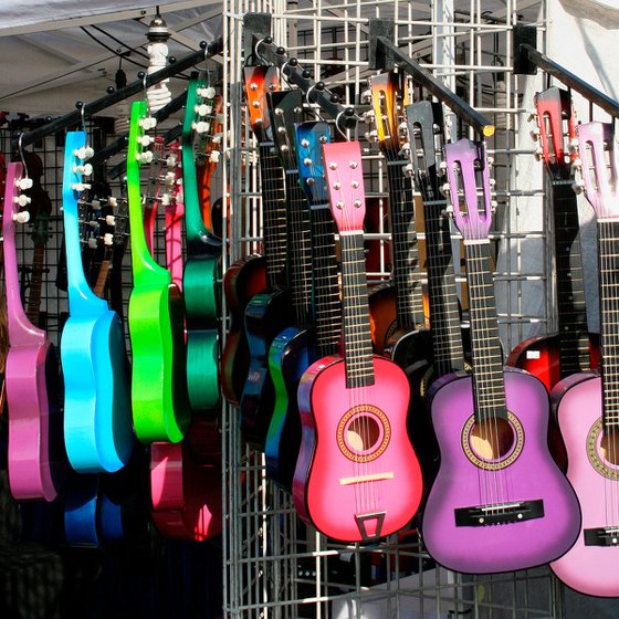 A vendor's booth selling brightly colorful guitars at the historic Indio International Tamale Festival in Indio California, captured by street photographer William Dey.