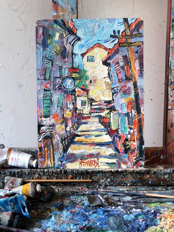 This artwork is made by traditional technology. Oil paints, canvas and linseed oil. I love to write etudes from life in a bright impressionistic manner. Small colorful strokes form a rainbow palette. I will try to convey the movement of air masses and the difference between illuminated and shady places.