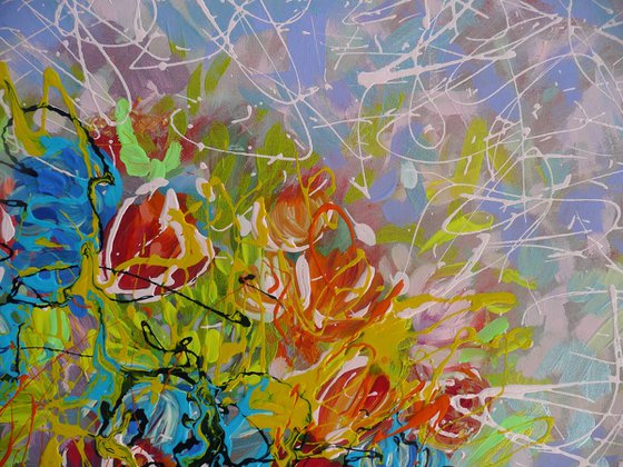Floral abstract painting in acrylics ,oils and enamel paintis on deep boxed canvas . Brightly coloured florals on a pastel background . Signed and ready to hang