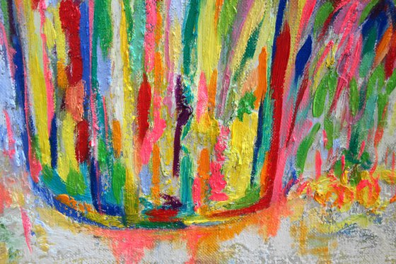 Large floral oil painting on linen canvas in brightly coloured textures . painted in oils and oil pastels and impressionistic in style . unframed