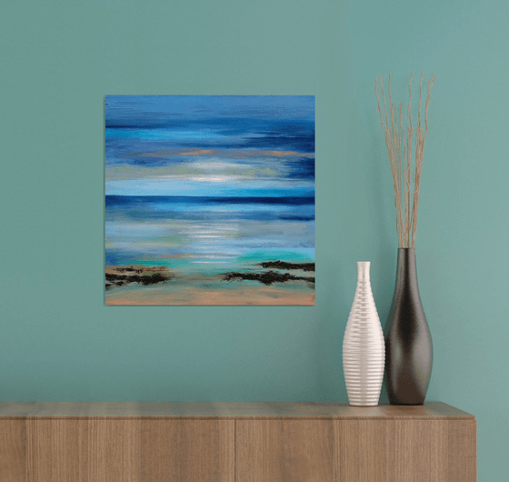 This scene is an expression of sea and surf on a quiet afternoon beach combing. Using acrylics and the texture of sand, I've worked in an impressionistic style beginning en plein air capturing the serene mood of the shore at low tide. The semi-abstract forms convey the sense of tranquillity, inviting the viewer into a realm of peaceful contemplation and will infuse any space with its soothing energy.
