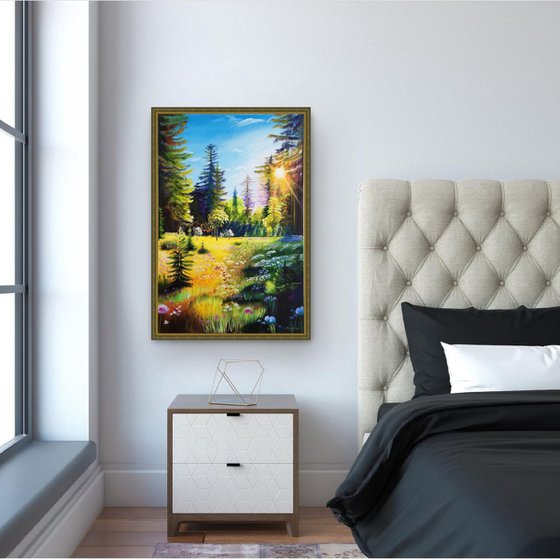 Step into a world of sunlight and serenity with “Sunlit Meadow”, a vibrant original oil painting that captures the healing essence of a summer forest. Golden light streams through towering evergreens and dances across a meadow bursting with wildflowers—lavender, daisies, poppies, and clover, each petal glowing with life.