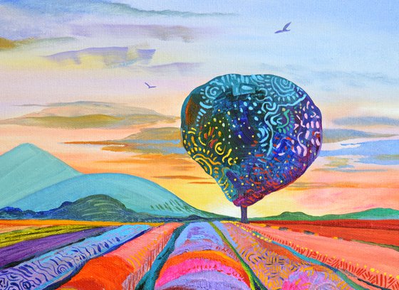 2021, "Sunrise Over Purple Fields" - mixed media painting, ready to hang