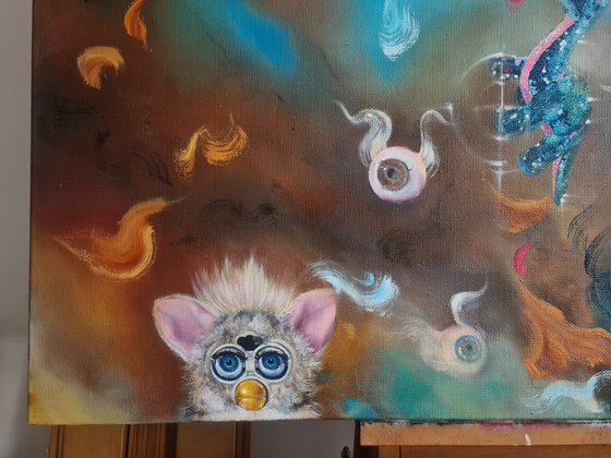 "Supersonic Play" is an oil painting that takes viewers on an interstellar journey. In the heart of this cosmic masterpiece, a baby astronaut 'Spacebaby' sits in a retro-futuristic space rocket, gazing directly at the Outer Space with curiosity and wonder. The astronaut's tiny hands grip the rocket's control panel, ready to embark on an adventure beyond the stars.