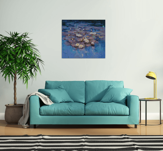 Inspired by quiet moments in nature, this impressionist floral painting invites a feeling of calm, stillness, and wonder. The petals seem to glow with soft light, and the layered knife strokes bring depth and movement to the water. There's a subtle sense of magic in the silence — as if time has stopped among the lilies.