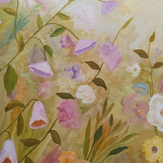 Colorful flowers blossom amidst lush greenery, creating a serene garden scene. Various shades of pink, white, and yellow flowers spread across the canvas, adding depth and vibrancy._x000D_