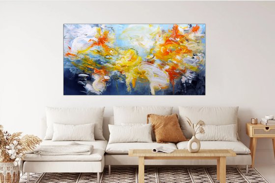 "Swirling Harmony," an abstract painting on vibrant shades of blue, orange, and yellow, evokes a sense of movement and balance and it would be perfect for any modern space. This gorgeous painting adds a touch of energy and warmth, making it an ideal centerpiece for your home or office.