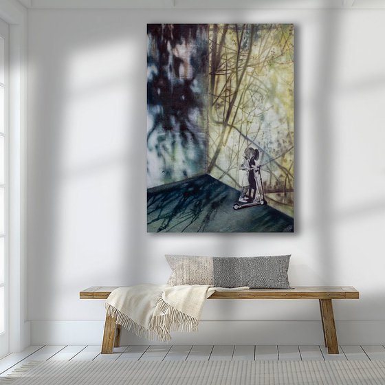 “TALK TO THE WALL AND THE DOOR MAY LISTEN” is a slightly surreal melancholic urban landscape artwork in which a girl stands on her scooter in a dark corner. Surrounded by shadows of branches that seem to hold her captive and evoke a sense of mystery.