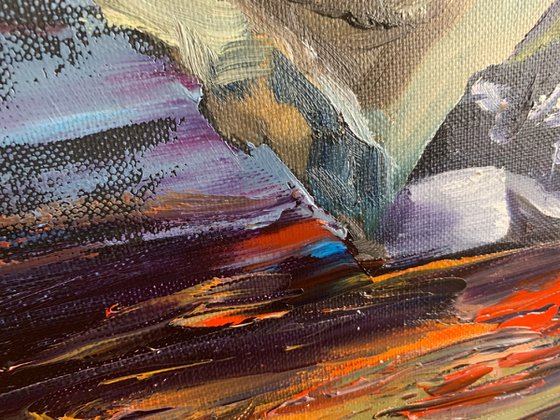 Evoking the passionate embrace of tango, this vibrant painting captures the dynamic movement and intimate connection between two dancers. The bold strokes and rich colors, particularly the fiery red of the woman's dress, contrast beautifully with the darker background, highlighting the energy and emotion of the dance. Reflections on the floor add another layer of visual interest to this captivating piece.
