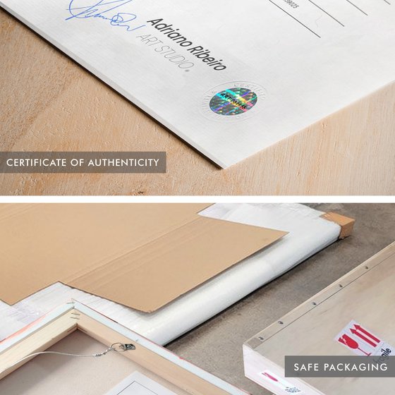 Ready to hang, the artwork features neatly painted edges, a signature on the back, and a Certificate of Authenticity. A pre-installed metal wire ensures easy wall mounting.
