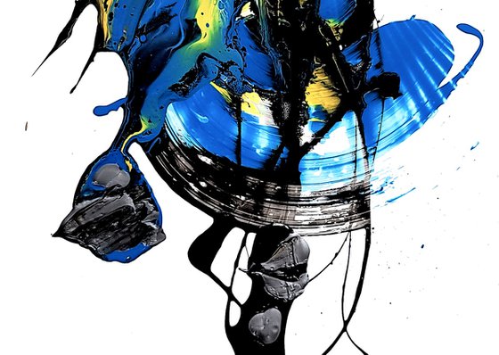 This abstract composition of a bell ringer is dominated by swirling black forms interspersed with vivid patches of blue and yellow against a stark white background. The black paint seems to flow dynamically, creating movement and depth, with areas that appear glossy and textured, suggesting rich layers. The blue elements provide a sense of calm and contrast, while the yellow highlights add energy and warmth. The piece conveys a sense of organic motion, resembling a figure or a living entity in transformation. While the message is uncertain, the resounding energy is unmistakable.