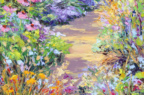 Sunlit hues of pink, purple and yellow flowers surrounded by greenery invite the viewer to take a visual stroll down this lovely garden path.