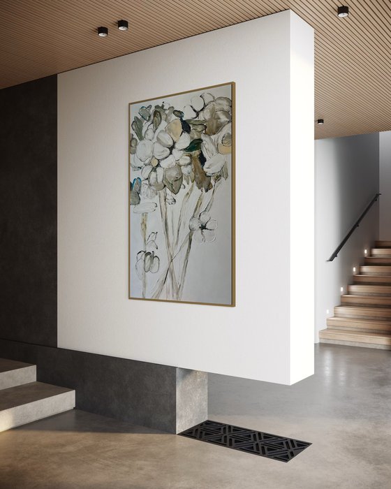 The Floraison Affair is a poetic abstraction of blooming—where nature’s quiet elegance meets the drama of emotion. Inspired by the first fragile signs of spring, this artwork captures that fleeting moment when life returns in subtle tones—white petals opening gently, soft green stems stretching through muted beige and ash-gray air. It is not a literal depiction of flowers, but a suggestion of them—an impression, a feeling, a memory.