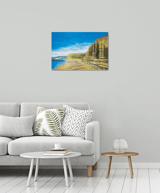 A contemporary impressionist painting of The Jurassic Coast in Summer, painted in a mix of vivid colours, and created in my signature style, which utilises a range of textures, tools and painting implements to create a unique visual effect.