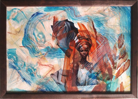 A set of four framed paintings are collages with bits of painting, all with the same colours and style. Each canvas shows bits of women's portraits in a lively abstract design. They used cuttings from note paper and printed materials, as well as translucent layers of paint, blue, turquoise and terracotta strokes to create a sense of movement and layering.
