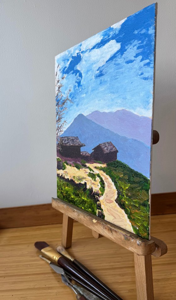 I saw these charming wooden cottages with Himalayas in the background and serenity all around, in Rumsu village in Himachal Pradesh, India and had to paint them.