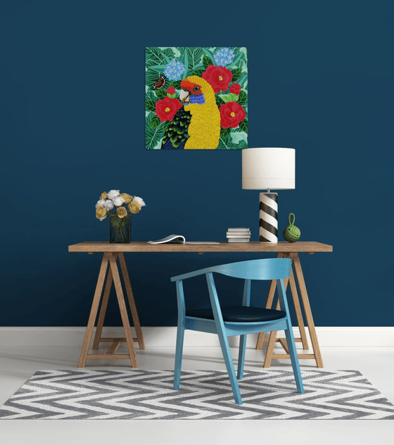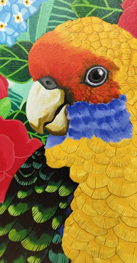 The series introduces vulnerable and endangered parrot species which are portrayed in highest details to enhance its natural Beauty. The title of the series creates a scenario where the parrot asks its viewers to keep a promise of never forgetting them. With current changes in the environment, it's a rare sight to witness such beautiful creatures which are unfortunately fading away with time. The composition brings out the vast diversity in nature in the form of unique birds and blooms. The series has 'forget me not' flowers in the backdrop that represents a promise of always remembering these parrot species so that their beauty does not fade away from our minds.