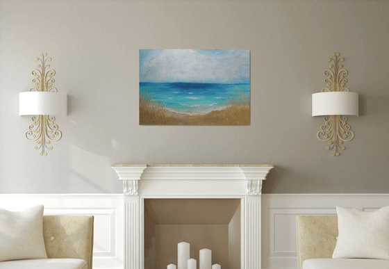 This piece was inspired by the beautiful beaches of Cornwall, I spent a week taking in the beauty of these immaculate beaches and have created this tranquil seascape emerging beyond the dunes.