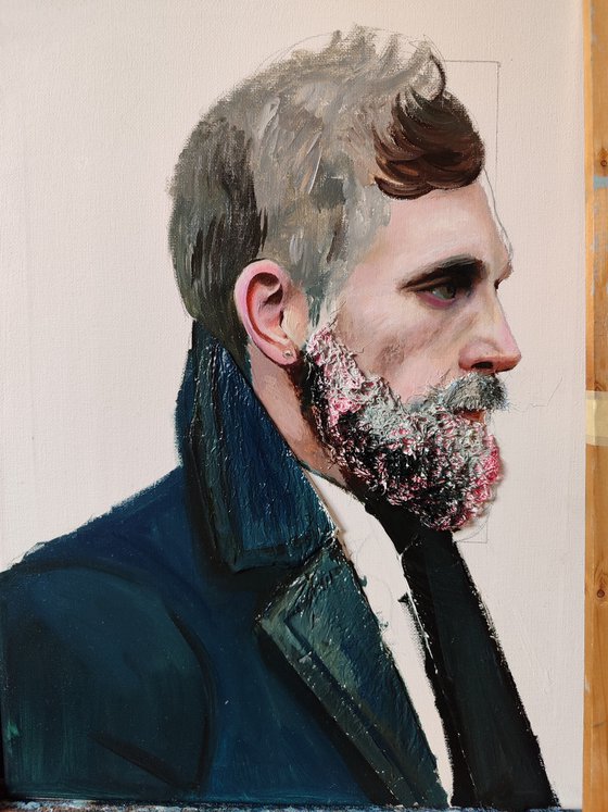 portrait done in oil on canvas first treated with acrylic chalk and with a net that forms the beard. There is also some paper glued to create thickness even in the collar of the jacket