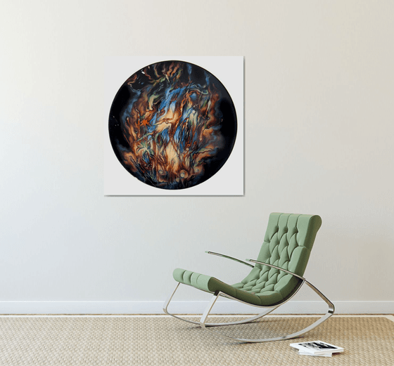 The Secret Garden is the represetation of a garden in the night where flowers and the vegetations are surrounded by the night. Caracterized by powerful colors this painting is coverd on the surface by a thik layer of transparent resin that makes the colors even more strong. this painting is framed with a mirrore like brass frame that reflects a golden light on the wall.