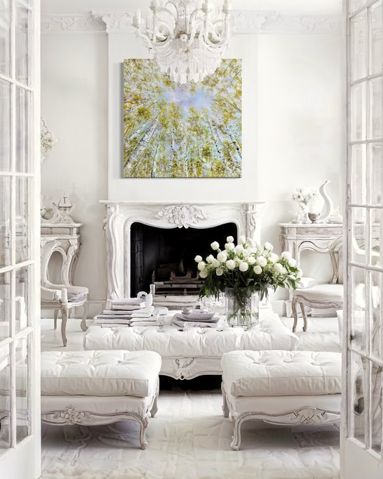 In creating this oil painting, I sought to meld abstract, impressionistic, and realistic touches to evoke the serene yet vibrant essence of a birch forest. The upward perspective invites viewers to lose themselves in the gentle dance of light and shadow amongst the whispers of leaves. Each brushstroke carries a breath of tranquility and the subtle vitality of nature, hoping to instill peace and a sense of connection in the home.
