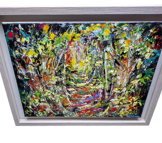 An original framed, acrylic artwork depicting a pathway through a dense forested area.
