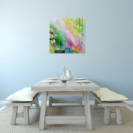 The painting is talking about starting to see the world differently. Every disaster is different, of course, but loss and gain always coexist. There is room for a change: Think new. My decision is clear. I created a garden of LOVE.