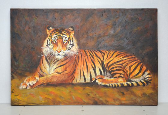In this oil painting, I sought to capture the majestic essence of the tiger, an emblem of strength and resilience. Brushstrokes imbued with realism and a touch of impressionism highlight the tiger’s fierce gaze and vibrant stripes, evoking a sense of awe and respect. This artwork symbolizes the courage to stand firm in the face of challenges, bringing a powerful energy to any space it inhabits. Oil painting on linen canvas, signed by the artist, varnished, ready for suspension.