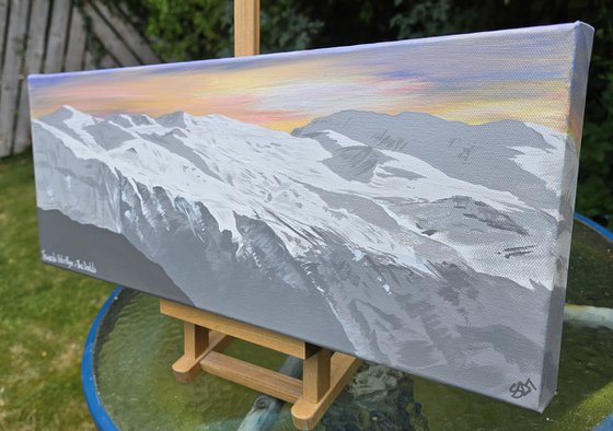 This original painting measures 20x8x1.5". The sides of the canvas are painted and there are D rings and string on the back so it's ready to hang on the wall. A coat of varnish is applied for protection.
