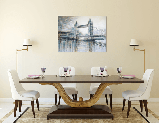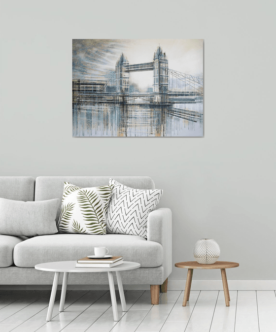 A contemporary impressionist painting of Tower Bridge, London, painted in a mix of subtle colours, and created in my signature style, which utilises a range of textures, tools and painting implements to create a unique visual effect.