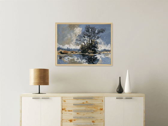 "Tranquil Tree on Water"captures the serene beauty of a lone tree standing gracefully by a calm lake.
