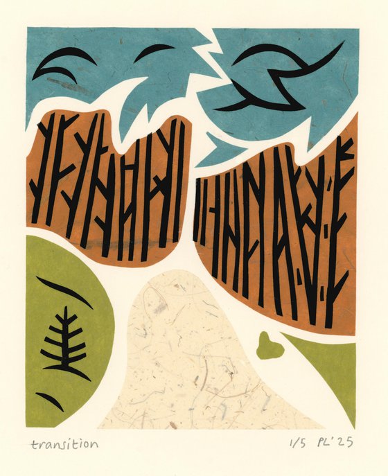I titled this ‘transition’ because the scene passes from dunes to pine woodland. But also, it is a change in my way of working – from printing coloured inks to printing black ink with paper additions. I think the two materials work well together and I hope to explore the combination further.