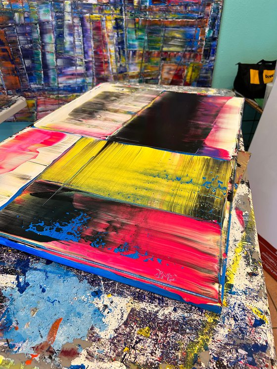 This is a unique modern PMS abstract acrylic diptych painting that will make a statement in your home or office. These pieces have a vibrant modern design aesthetic. They are fierce and full of energy, and movement. The colors streak and overlap, while also being contrasted by bold and subtle color shifts. The accents of yellow, hot pink, black, white, and hints of blue is both modern and striking. It is truly an abstract modern diptych painting like no other that will enhance your space.