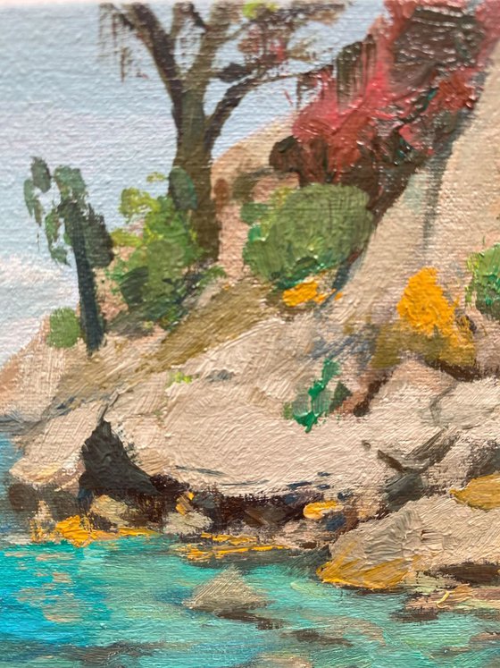 The painting, created in oil on panel, depicts a vibrant seascape on a sunny day. A rocky, sandy shoreline meets crystal-clear azure water, shimmering with shades of blue and green. The coastline is lush with tropical vegetation, adding a sense of life and warmth. The scene radiates tranquility and the refreshing beauty of a coastal paradise.