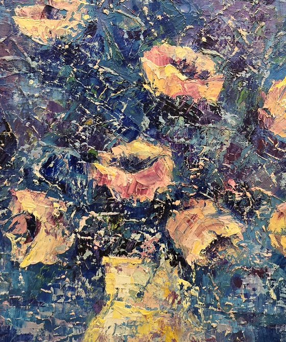 Bathed in a rich symphony of blues and violets, this expressive still life captures the ethereal glow of flowers gently blooming from a luminous vase. Painted in a bold impasto technique, each petal and brushstroke carries a sense of rhythm and quiet intensity. The yellow-pink blossoms seem to float in a sea of textured blue, as though emerging from a dream.
