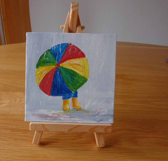 This little painting was inspired one very wet day when I came across a child determined to manage Mum's umbrella. I went straight home and painted this . It comes with its own little easel and thus can be situated on a cabinet or table eliminating the need for a frame.